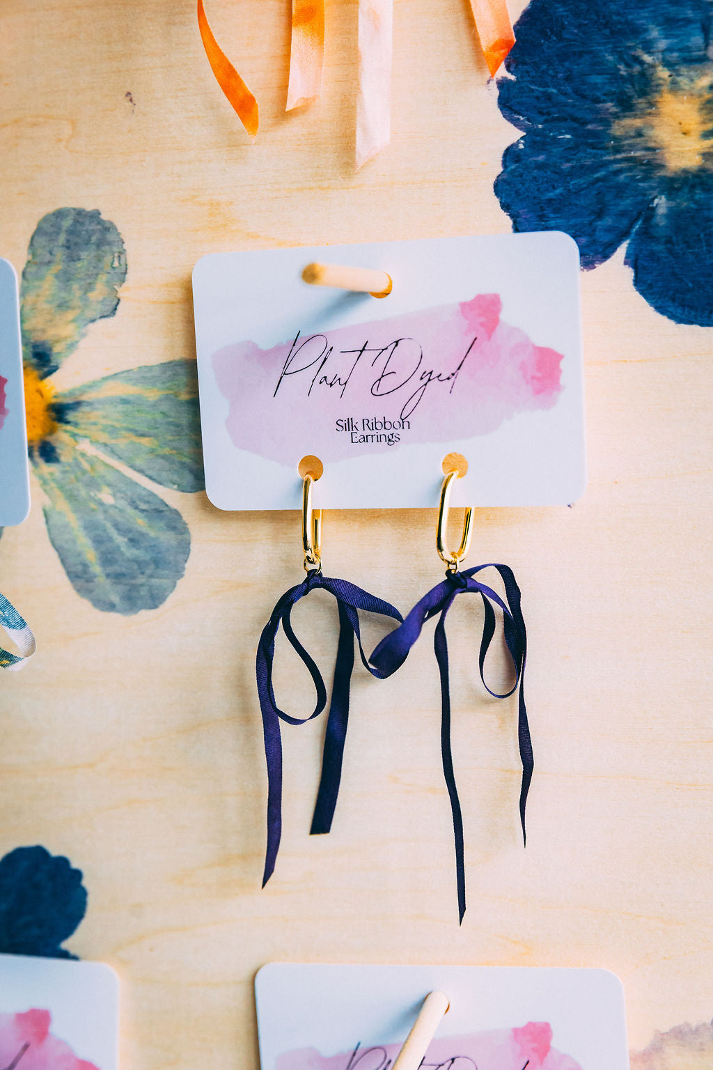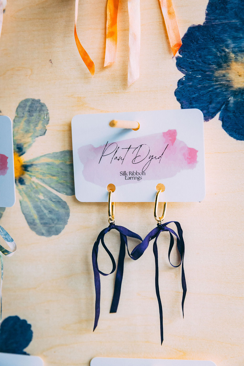 Naturally dyed silk ribbon earrings with soft movement and organic color.